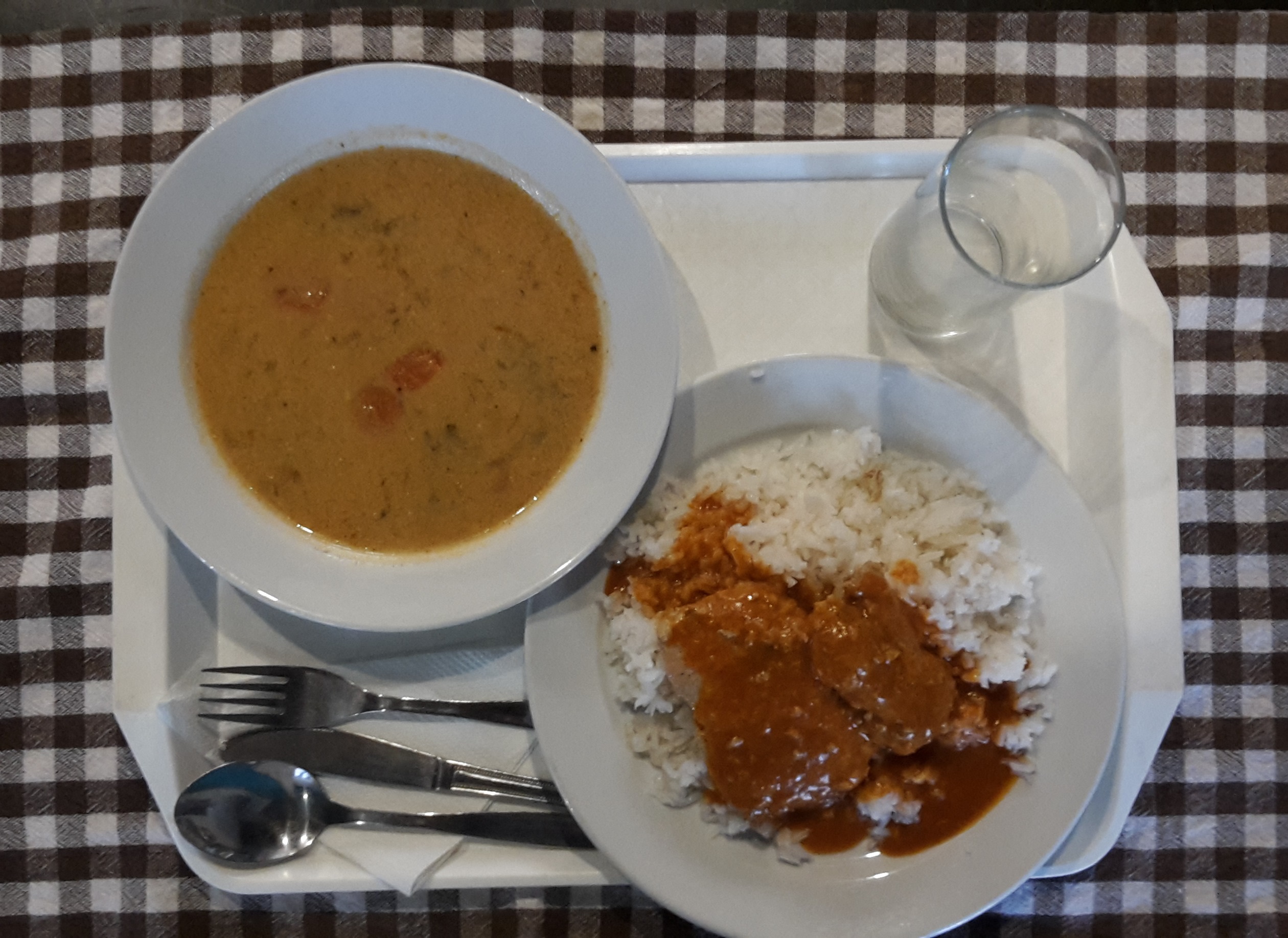A rizs csomókba összeálló, villával kevésbé könnyen szétnyomható. Egyenletesen puhára főtt. A mártás sűrűn folyó. A hús jól tisztított, de változó állományú, egy része rugalmasan puha, máshol kemény, száraz, kevésbé átpuhult, nehezebben rágható. |