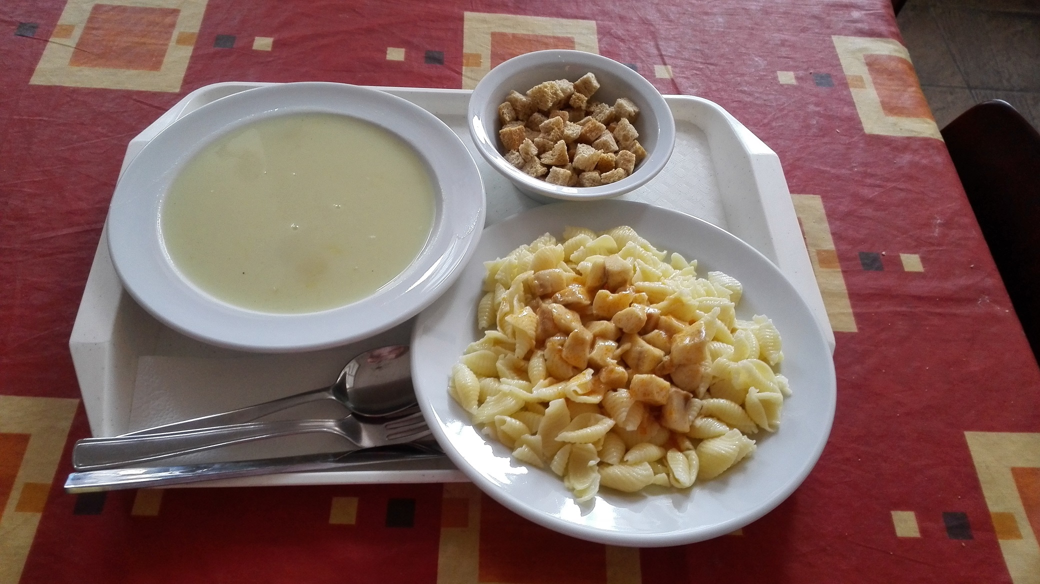 Menü: Francia hagymakrémleves pirított kenyérkockával, Halpaprikás kagylótésztával