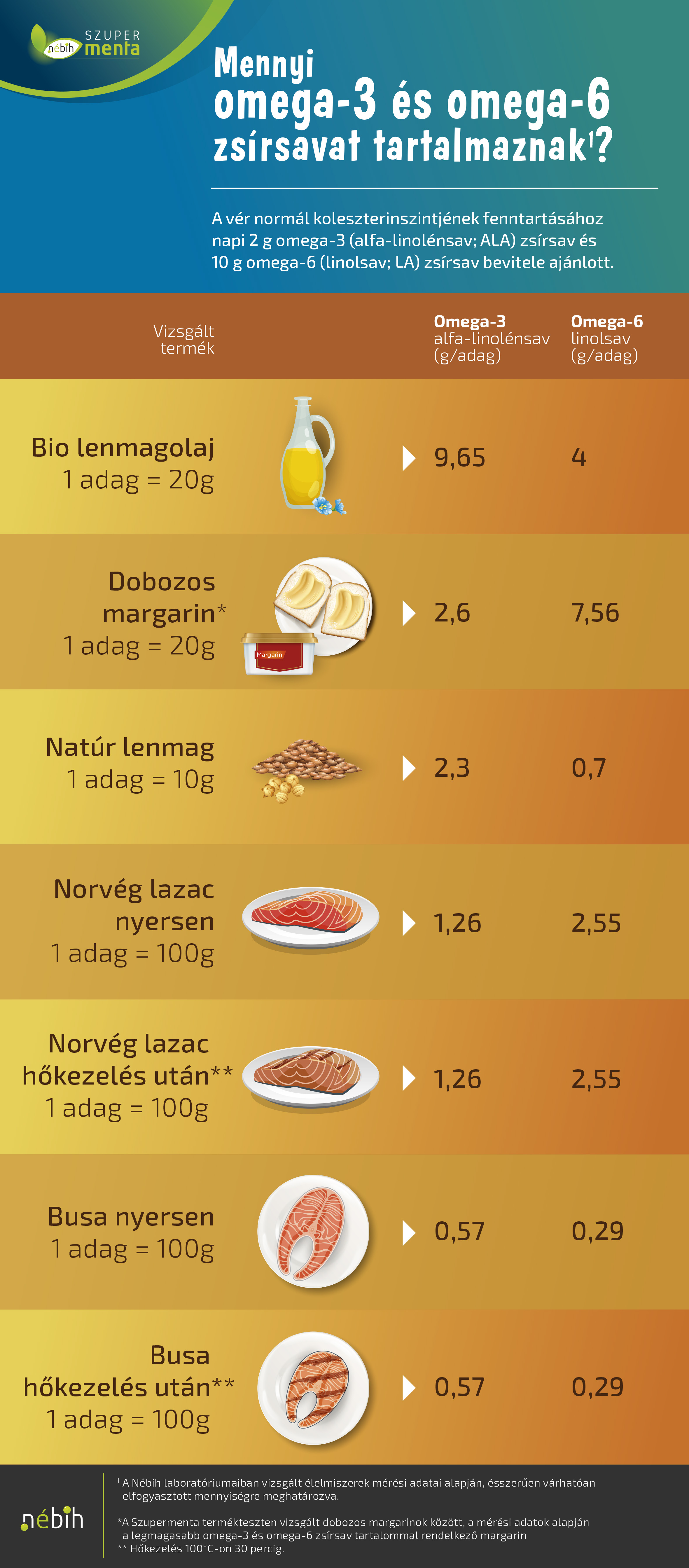 Rendhagyó vizsgálatsorozattal szakította meg a terméktesztek sorát a Nemzeti Élelmiszerlánc-biztonsági Hivatal (Nébih) Szupermenta programja. A speciális vizsgálat kiindulópontja a legutóbbi dobozos margarin termékteszt volt, amelyben a szakemberek a margarinok omega-3 és omega-6 zsírsavtartalmát is górcső alá vették. A teszt folytatásaként laboratóriumi vizsgálatokkal annak is utánajártak, vajon a margarin, a bio lenmagolaj, a natúr lenmag, a norvég lazac, vagy a busa fogyasztása járul-e jobban hozzá ezen esszenciális zsírsavak hatékony beviteléhez.