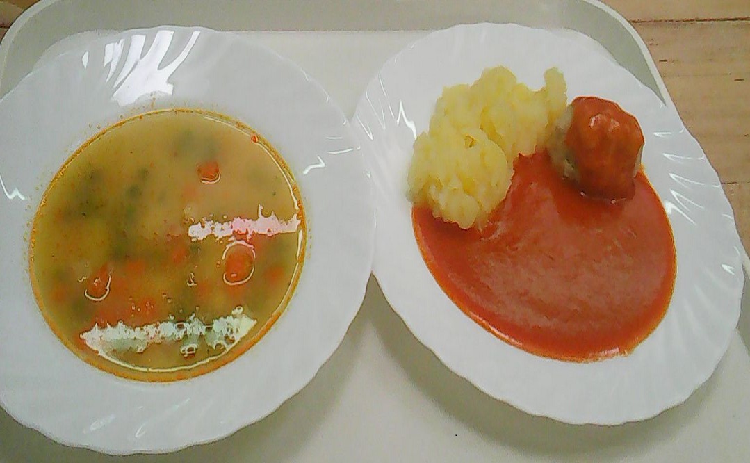Menü: Zöldborsóleves, Húsgombóc paradicsommártás és főtt burgonya