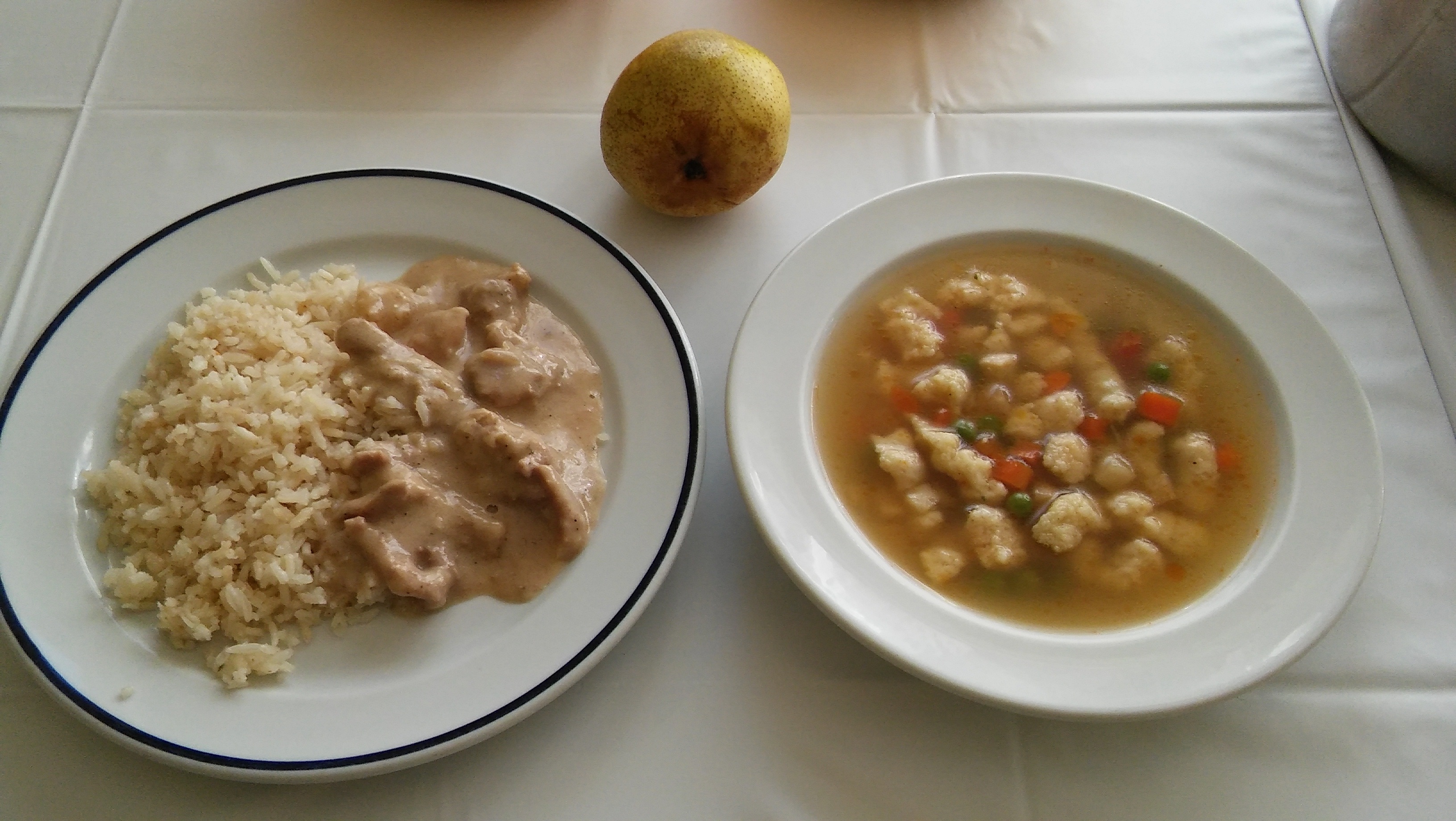 Menü: Daragaluska leves, Borsos tokány rizzsel, Körte