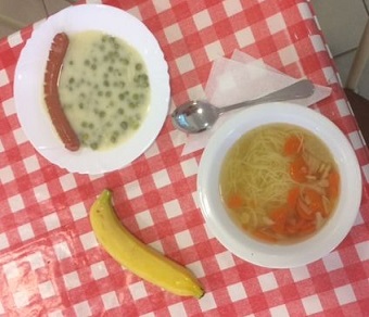Menü: Csontleves cérnametélttel, Zöldborsófőzelék, sült virsli, Banán
