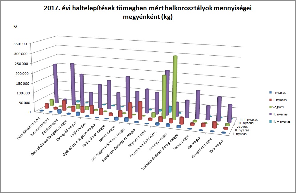 Megyei bontásban mutatja a telepített korosztályok mennyiségét a következő, a 3. ábra. A megyénként eltérő halgazdálkodási vízterületek száma és területei miatt nagy a különbség a kihelyezett halmennyiségek között. A telepített korosztályok arányai azonban hasonlóak, elsősorban abban, hogy a legtöbb megyében a háromnyaras hal telepítési aránya a legmagasabb. Két helyen a vegyes korosztály mennyisége szintén magas, de ez a vegyes korosztály esetében is gyakran magas a harmadik nyaras halak aránya. Az ábrán az összes halfaj korosztályait vettük figyelembe, de mivel a telepített halak között a ponty aránya a meghatározó, az arányok a legtöbb esetben hasonlóak. A kétnyaras korosztály telepítését két megyében helyezik előtérbe, de ezekben a megyékben sem érik el három nyaras korosztály arányát.