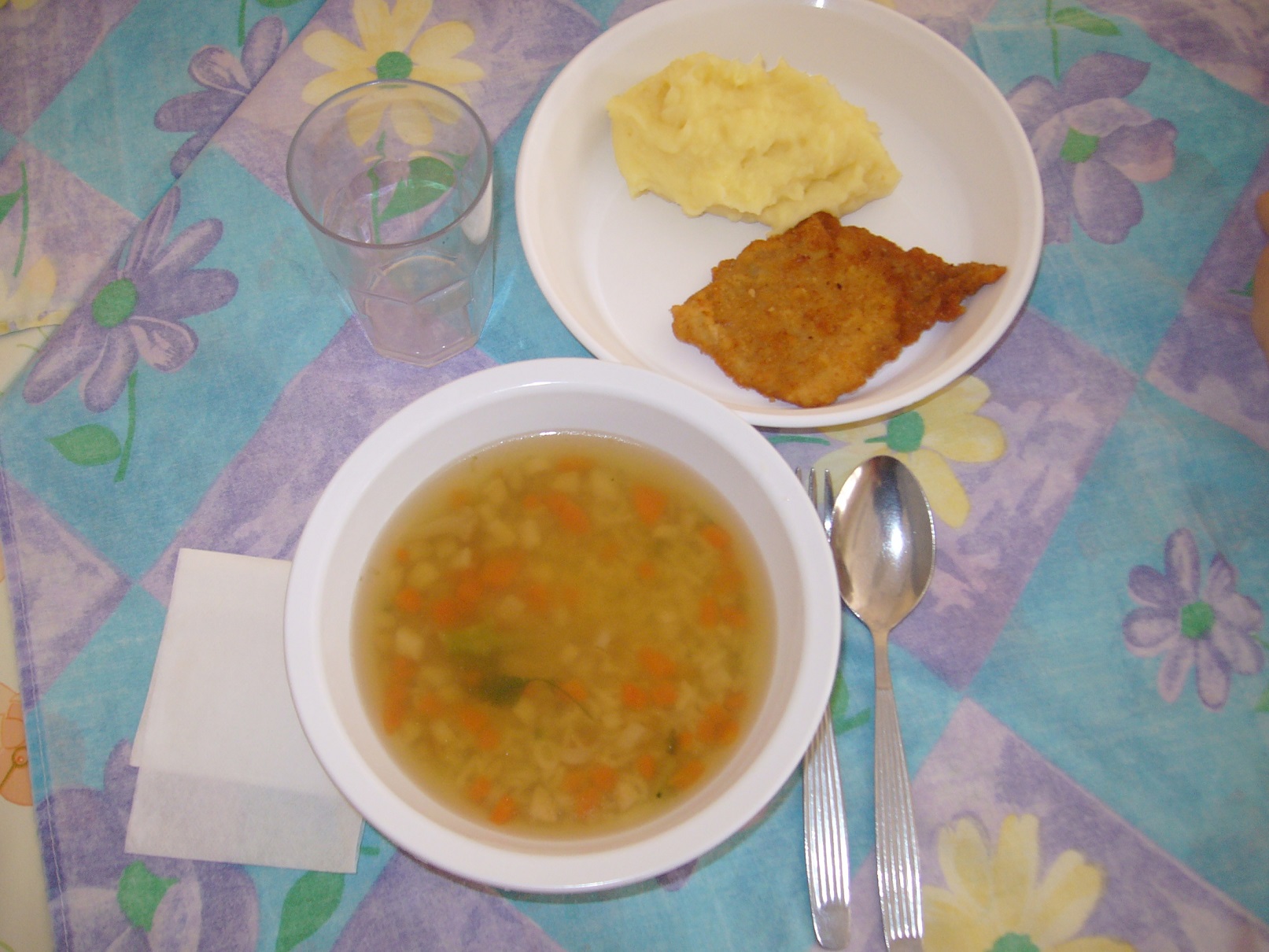 Zöldségleves Brokkoli (mirelit) Karfiol Petrezselyemgyökér Sárgarépa Só Vegeta Vöröshagyma Zeller Étolaj ABC tészta Rántott szelet, burgonyapüré Sertés karaj Tojás Liszt Zsemlemorzsa Olaj Só Burgonya Margarin Tej |