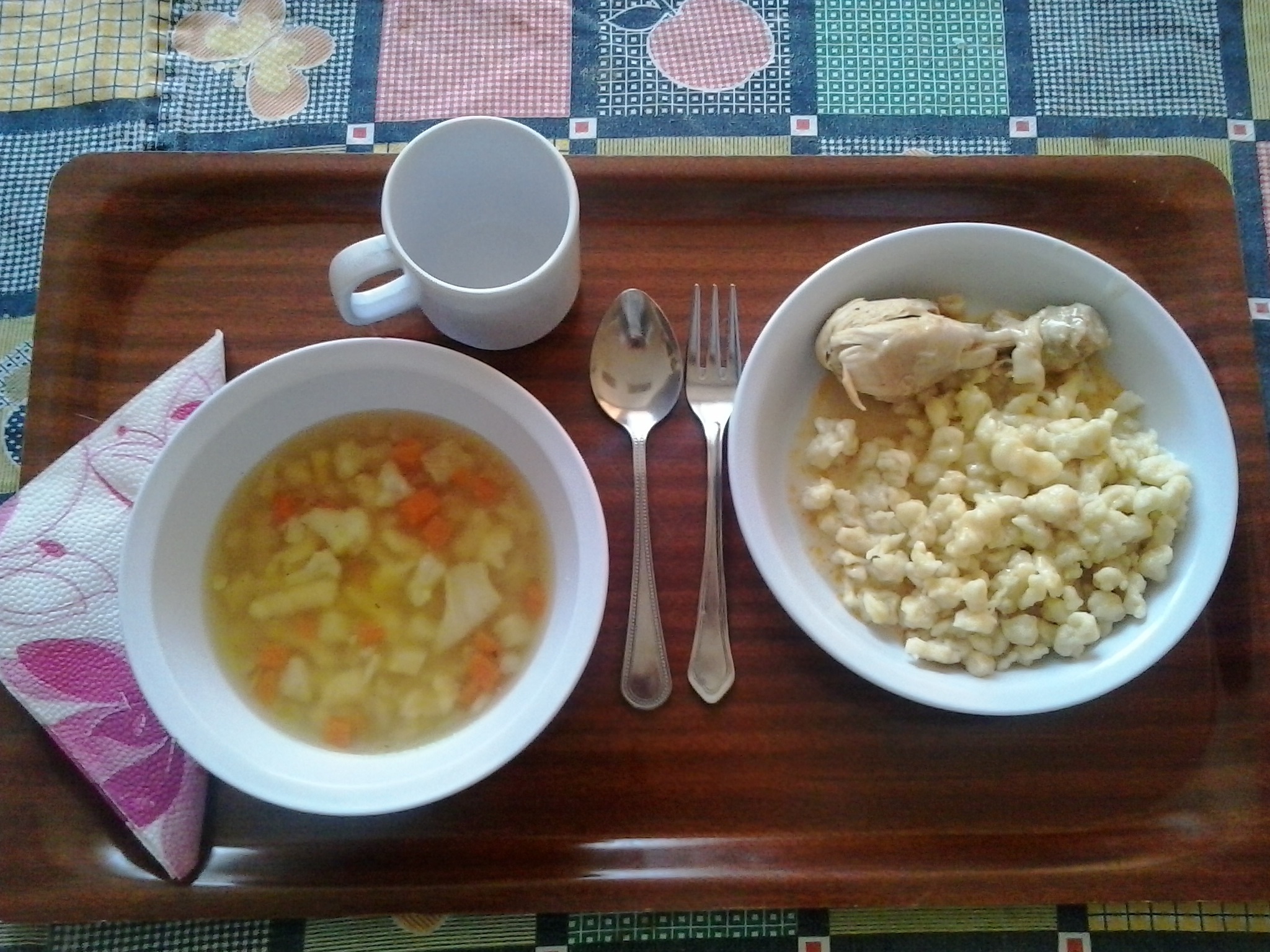 A lé híg. A zöldségek kissé túlfőttek. A galuska megfelelően puha, nem szétfőtt. |