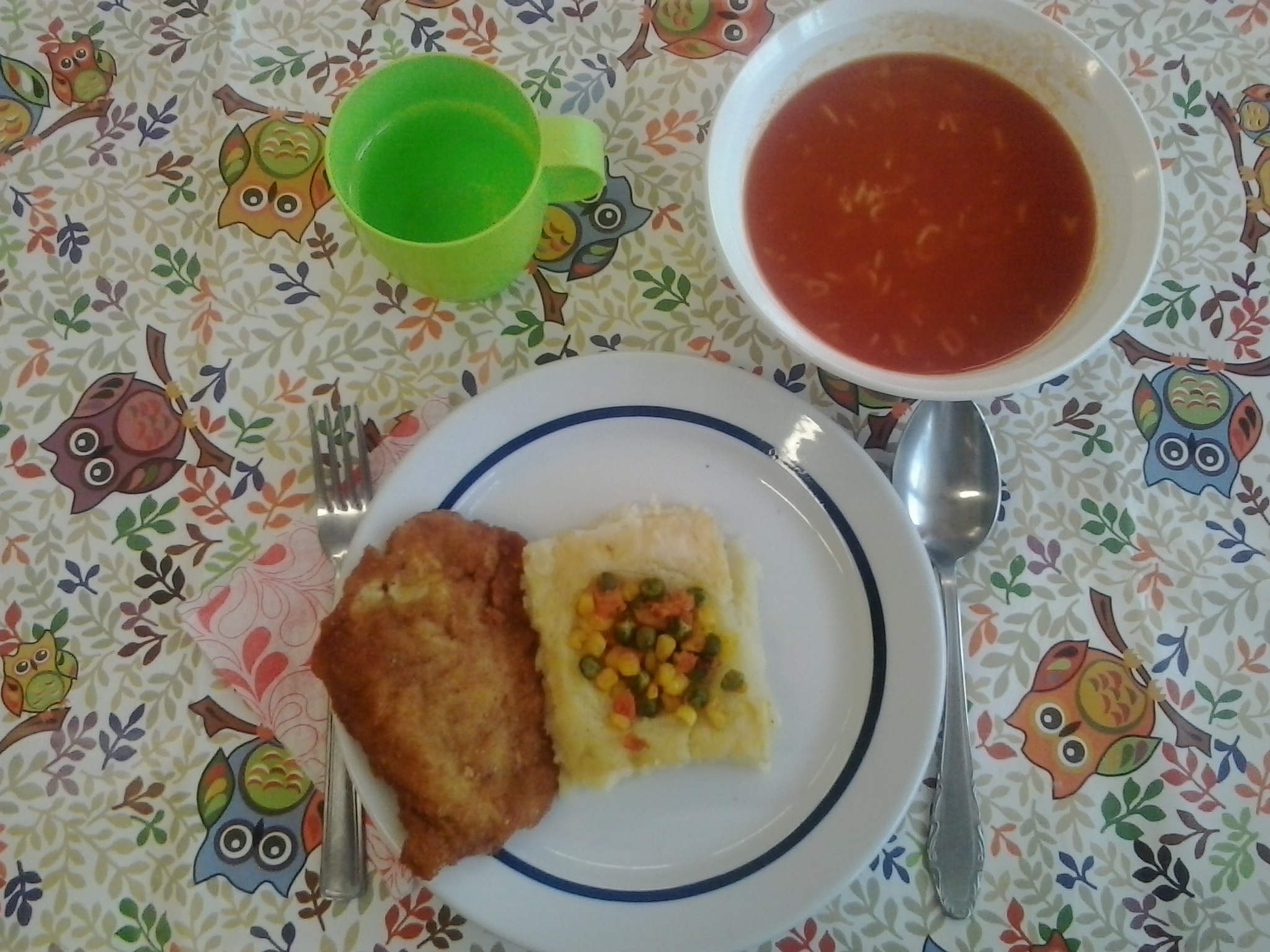 Paradicsomleves Paradicsompüré Vöröshagyma Kristálycukor Ételízesítő Só Liszt Olaj Bors Rozmaring Fűszerpaprika ABC tészta Zeller Rántott tonhal, virágáruslány köret Natúr tengeri halfilé Zsemlemorzsa Liszt Tojás Burgonya Tej Rama Mexikói zöldségkeverék Olaj Só Ételízesítő