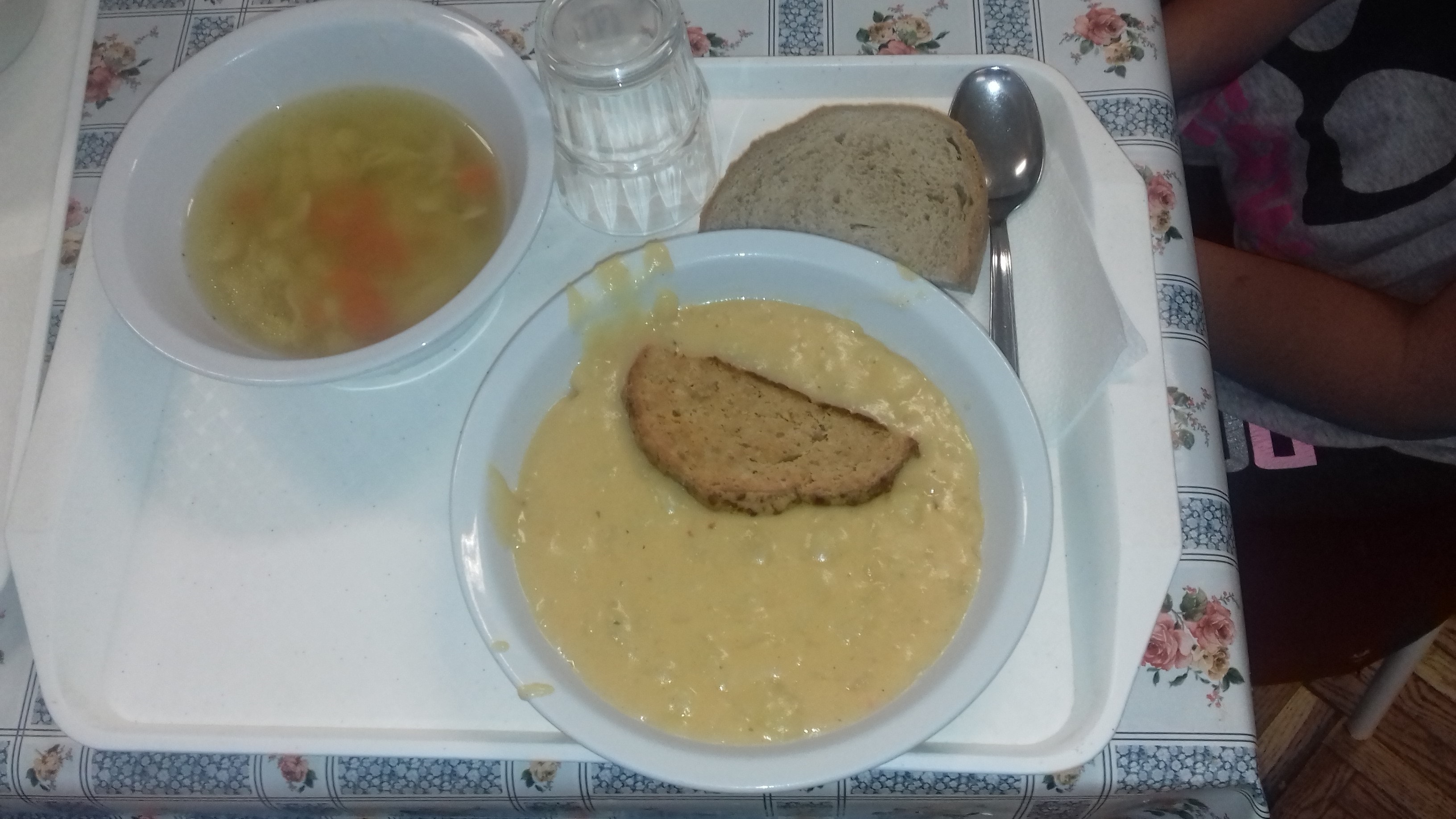 Menü: Zöldségleves, Burgonyafőzelék, sertésvagdalt, Barnakenyér