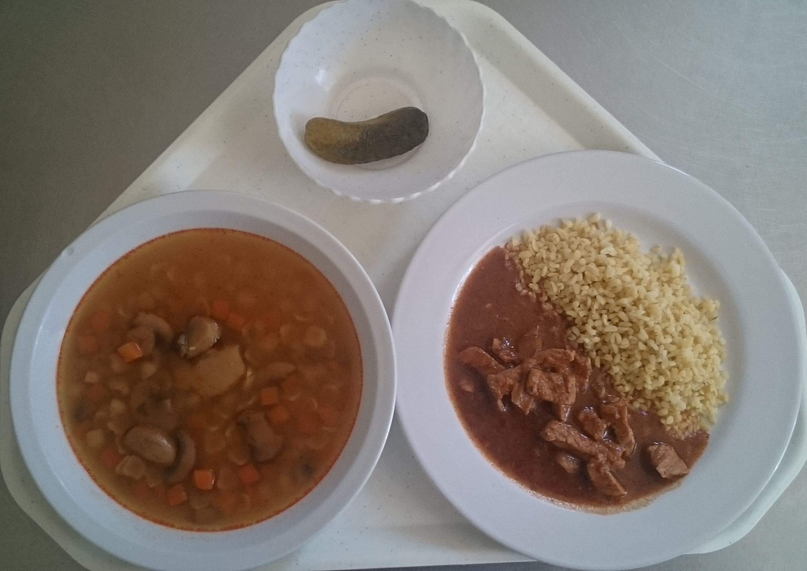 Menü:Gombaleves, Borsostokány bulgurral, Csemegeuborka