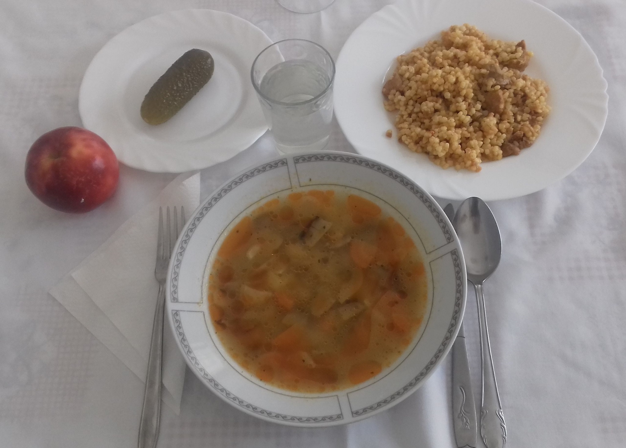Menü: Gombaleves, Tarhonyáshús, Alma, Csemege ízesítésű uborka