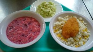 Menü: Gyümölcsleves, rántott csirkemell kukoricás rizzsel és káposztasalátával
