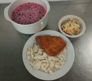 Menü: Gyümölcslves, rántott szelet rizzsel és savanyúsággal