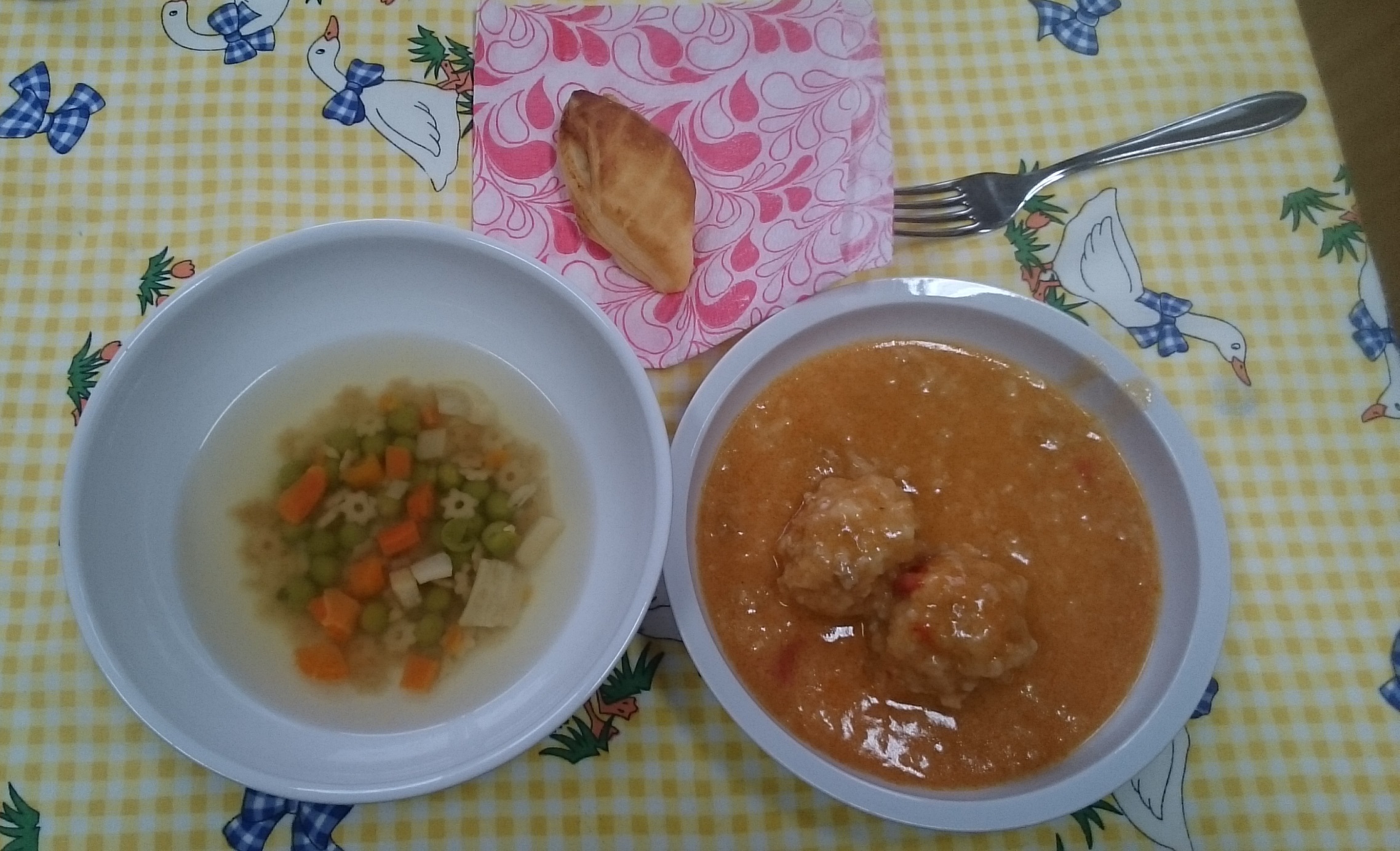 Zöldborsó leves Sárgarépa Gyökér Karalábé Zellergumó Vöröshagyma Olaj Só Őrölt bors Zöldborsó (mirelit) Csillag durumtészta Lecsógombóc Sertés comb Rizs Paradicsompüré Só Őrölt bors Vöröshagyma Cukor Tojás Fűszerpaprika Olaj |