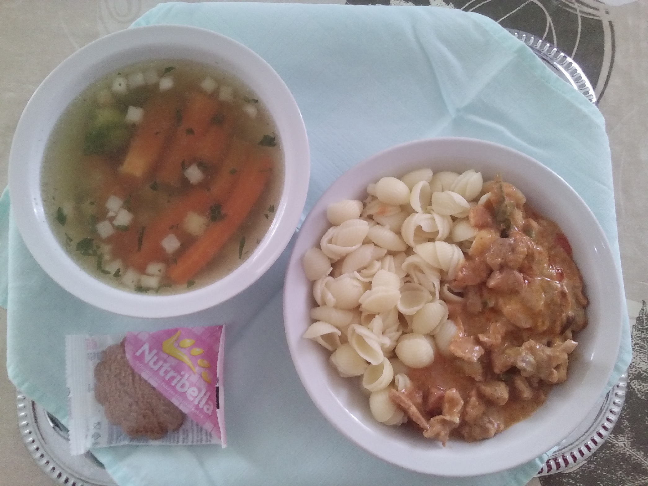 A lé tiszta, hígan folyó, a zöldségek és a tészta kellően átfőttek, nem elpuhultak. |