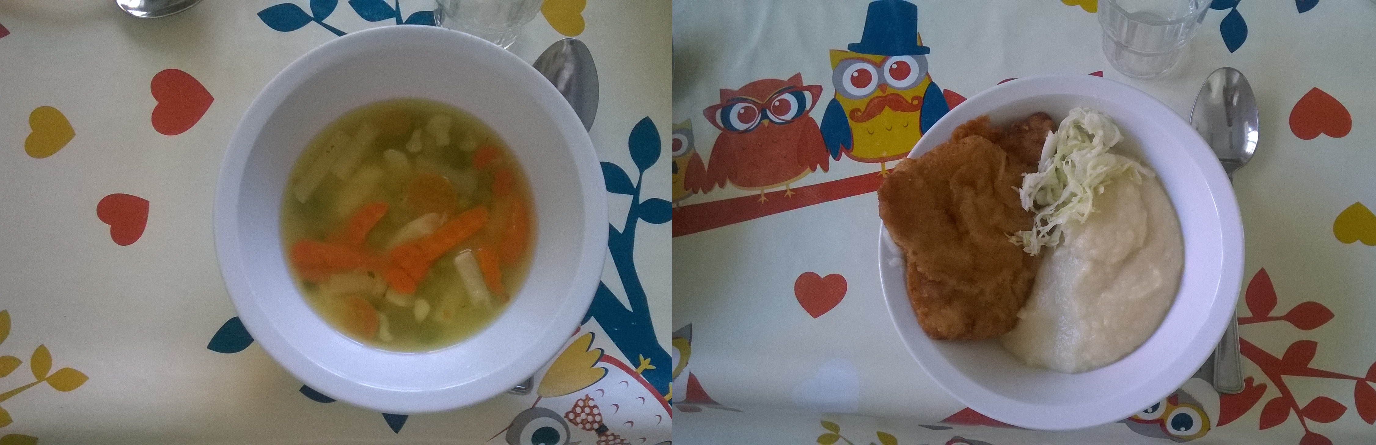Menü: Zöldségleves, Krumplipüré rántott sertésszelettel,