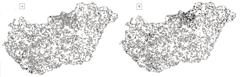 Trichinella-fajok előfordulása Magyarországon: balra a T. spiralissal, jobbra a T. britovival fertőzött róka- és vaddisznóminták gyűjtési helye