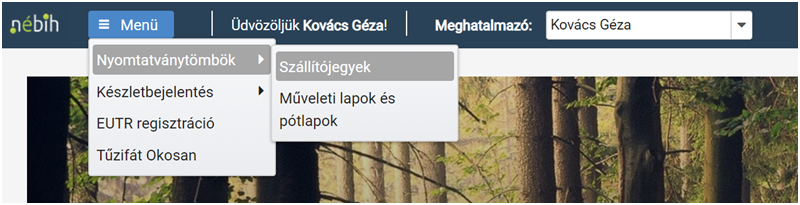 A megjelenő EUTR menüben a „Nyomtatványtömbök” → „Szállítójegyek” vagy „Műveleti lapok és pótlapok” menüpontra kattintva érhető el a nyomtatványtömb-bejelentés.