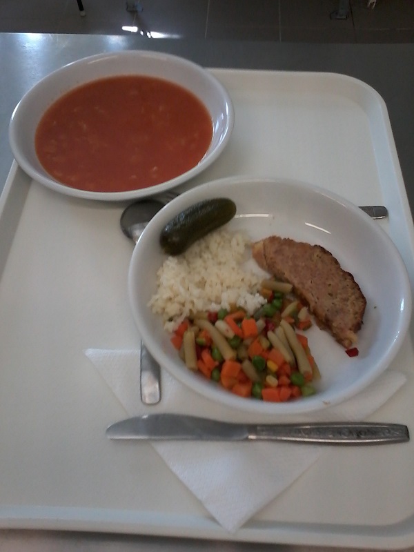 | Állomány: | A vagdalt felső kérge ropogósra sült, belseje kellően átsült, kissé száraz, nehezen rágható részeket nem tartalmaz, rágási maradékod nem ad. A hús lazítóanyaghoz viszonyított aránya kissé kevés. A rizs jól átfőtt, kissé száraz, az összeállt csomók könnyen szétnyomhatók. A zöldségek a zöldbab kivételével kellően puhák, jellegzetesen rugalmasak. A zöldbab kissé szétfőtt, puha. |