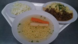 A szaft a kelleténél hígabb, zsírosabb. A hús nem megfelelően tisztított, inas-mócsingos részt is tartalmaz, ami kevésbé jól rágható. A burgonya puha, jól átfőtt. |