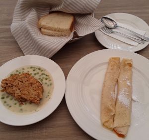 2 db egyenletesen feltekert, egyenletesen vékony tésztából sütött, törtfehér-krémszínű, világosbarna sülési foltokkal tarkított palacsinta a második fogás. Széle ép, a töltelék megfelelő mennyiségű narancsos színű baracklekvár. Teteje porcukorral szórt. |