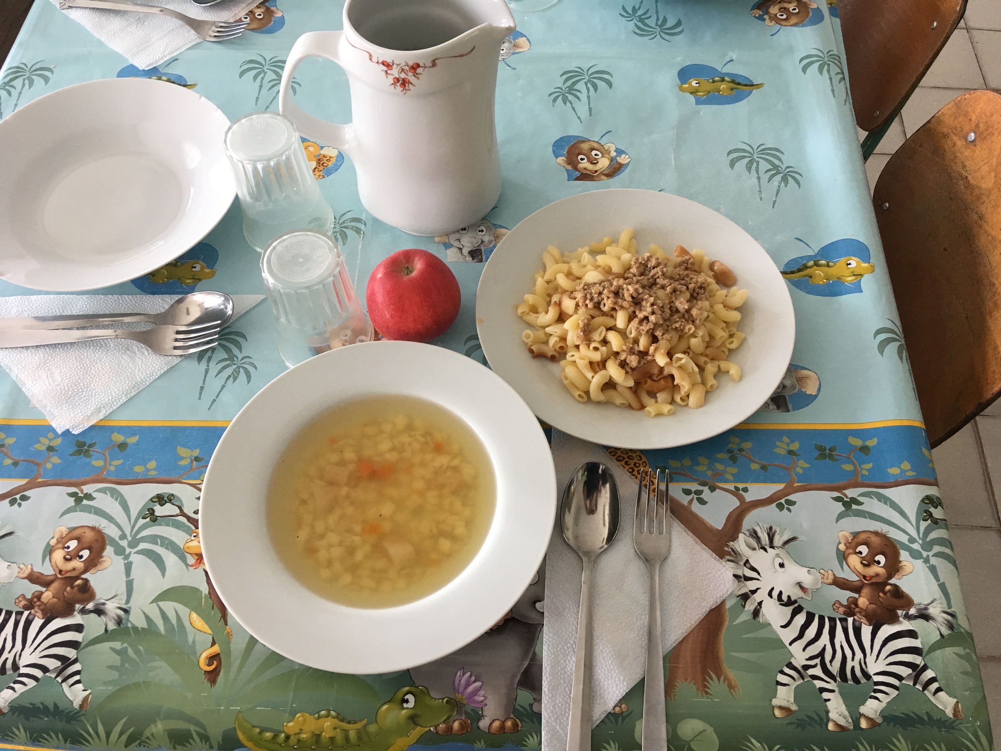 Menü: Zöldségleves, Húsos ragu szarvacska tésztával, Alma