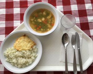 | Külső megjelenés: | Világos, opálos lében változó méretű galuskadarabok, zöldborsószemek, sárgarépa- és petrezselyemkockák láthatóak. Tetején piros zsírcseppek és petrezselyemzöld foszlányok úsznak. Egy petrezselyemkocka nem megfelelően tisztított. |