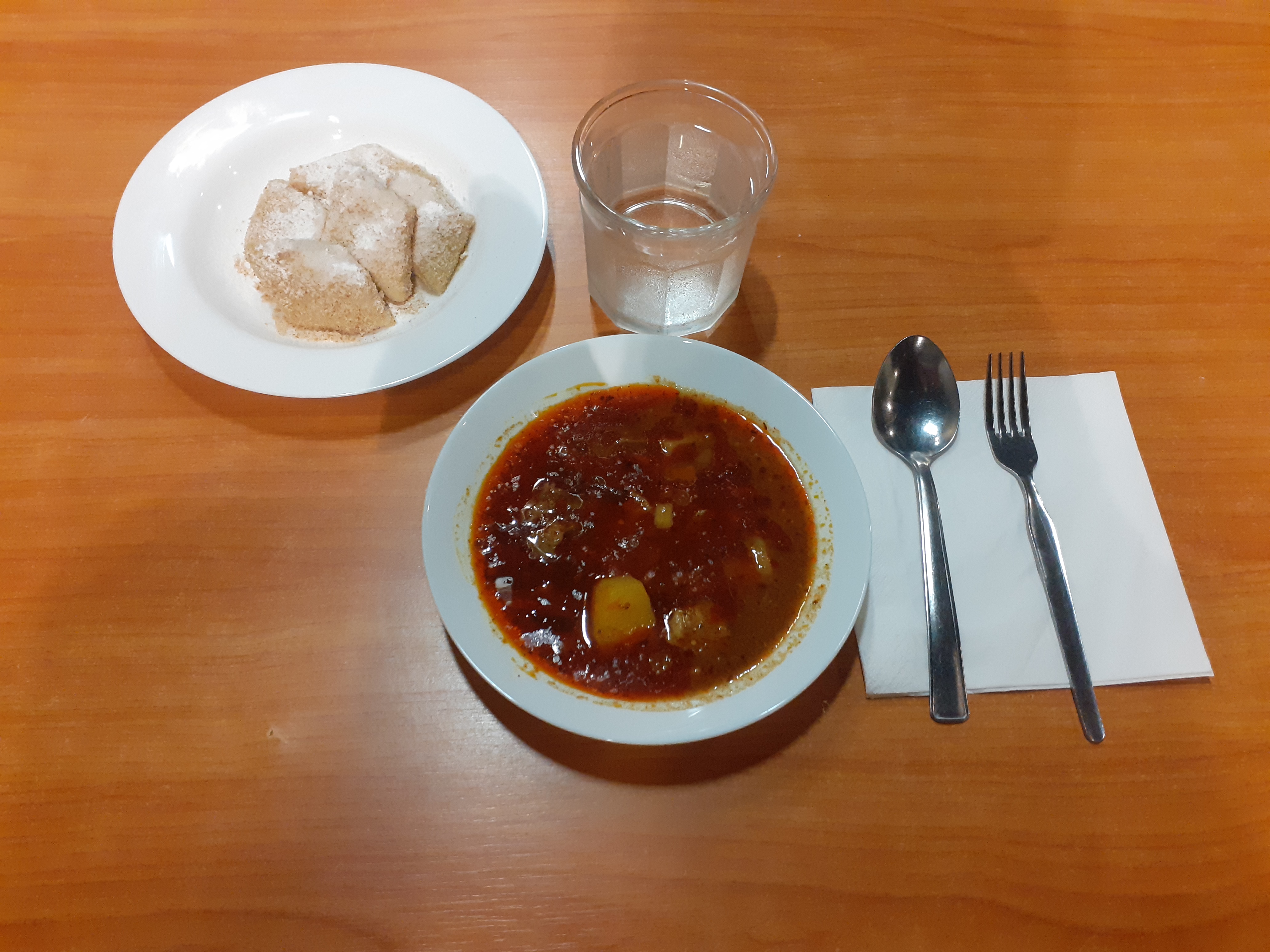 | Állomány: | Az alaplé megfelelő sűrűségű, de túl olajos. A hús puha, de zsíros, mócsingos részeket tartalmaz. A zöldségek puhák, átfőttek. |