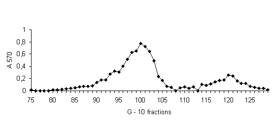The void volume fraction after gel filtration on Sephadex G-10 was resolved in 10 % acetic acid and loaded into Sephadex G-50 column (3x90 cm). Elution was performed by 10 % acetic acid at a flow rate 9.5 ml.h-1. The content of peptides in fractions obtained after gel chromatography was determined by the measurement of absorbancy at wave length of 280 nm. All fractions were lyophilisated and tested with BP-A31 cells.