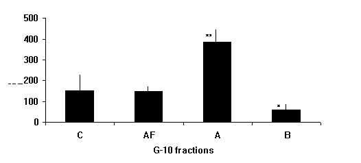 C - only cells, AF - nonseparated amniotic fluid, A,B - fractions obtained by gel chromatography, * = p < 0.05, ** = p < 0.01