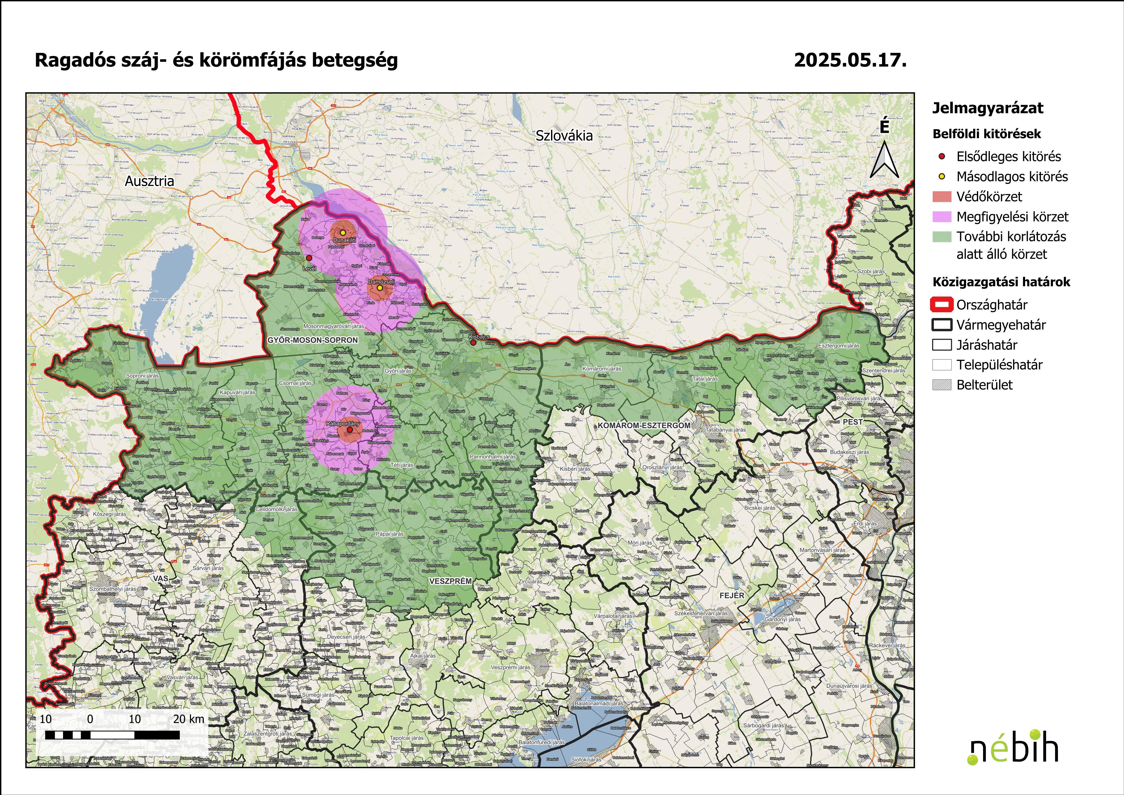 - 2025. június 6. napján megszüntetésre kerülnek a ragadós száj- és körömfájás betegség megerősített kitörései körül kialakított védő- és felügyeleti körzetek, illetve a további, korlátozás alatt álló körzetek a ragadós száj- és körömfájás magyarországi és szlovákiai kitöréseivel kapcsolatos egyes veszélyhelyzeti intézkedésekről szóló (EU) 2025/672 végrehajtási határozat mellékletének módosításáról rendelkező 2025/1097 végrehajtási határozat alapján. (ÉlfF/394/2025 Országos Főállatorvosi levél (2025. június 5.))