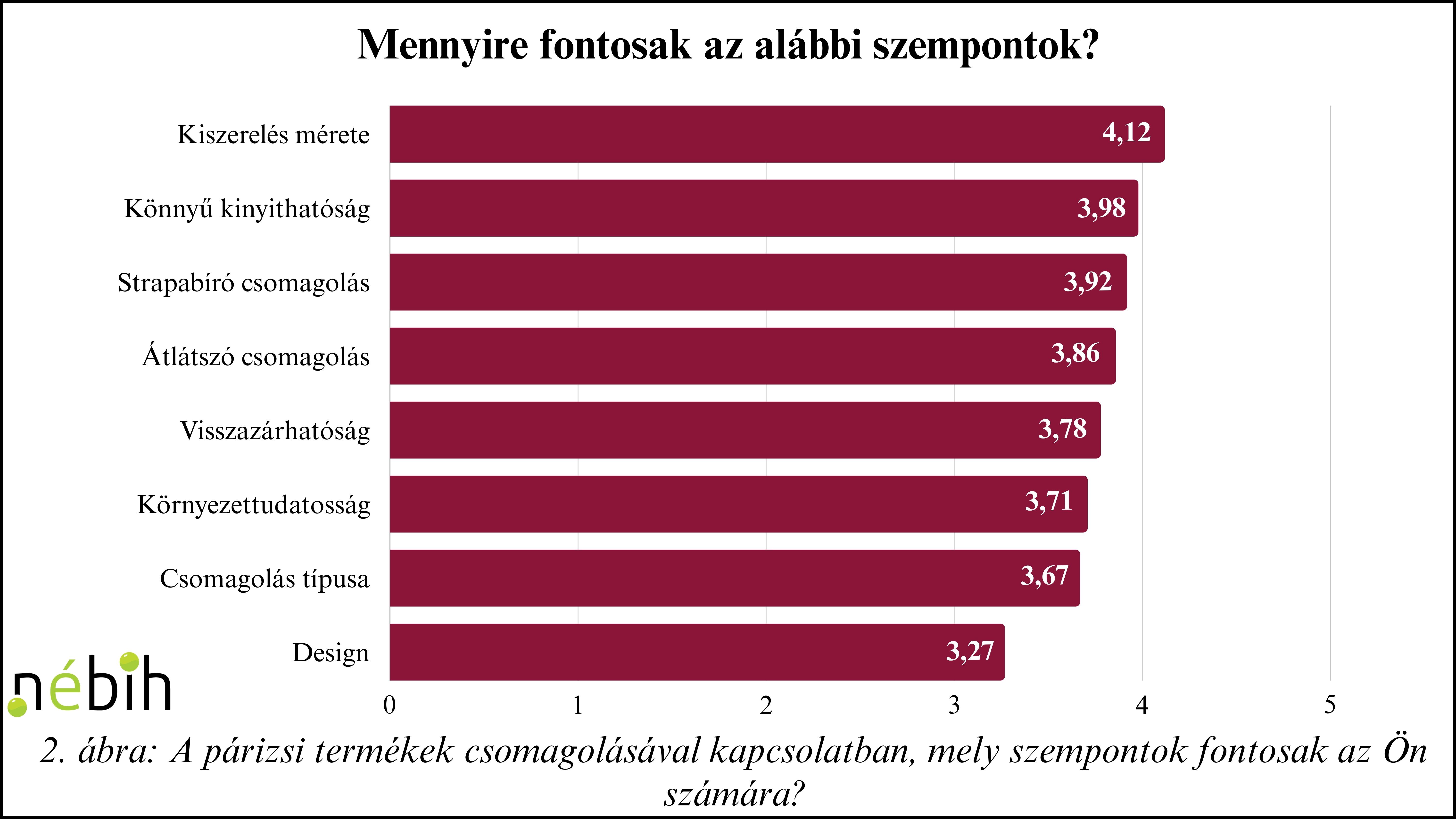 A vásárlók számára a párizsi csomagolásánál a termék kiszerelésének mérete az elsődleges szempont, ezt követi a könnyű kinyithatóság és a strapabíró csomagolás. A 2. ábra diagramján megfigyelhető, hogy a megadott szempontok egymáshoz közeli pontszámokat értek el, azonban a legkevésbé fontos tulajdonságként az esztétikus megjelenés, vagyis a design szerepelt.