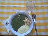 Jellegzetes, élénk haragoszöld színű parajfőzelék. Benne néhány apró fehér lisztcsomó lázható. |