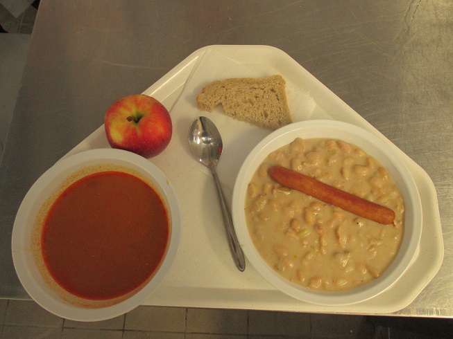 Menü: Zsurmóka leves, fejtett babfőzelék sült virslivel és kenyérrel, alma