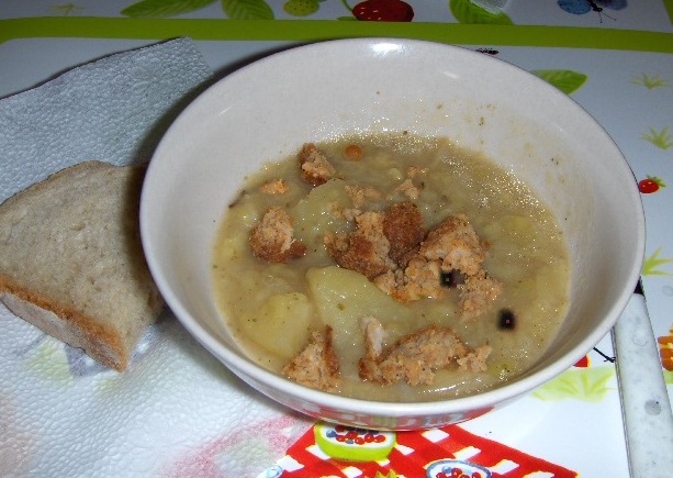 A burgonya puha, a főzőlé sűrű. A kelkáposzta puha, szinte pépes, de rostos szálas. |