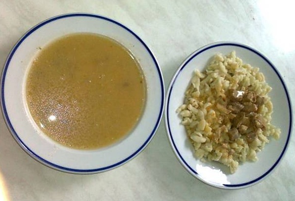 Drapp színű tejfölös lében gombaszeletek, karika tészta, kevés hagyma, zöldfűszer, pirospaprika és borsszemcse. Tetején fehér tejföl- és apró zsírpöttyök. |