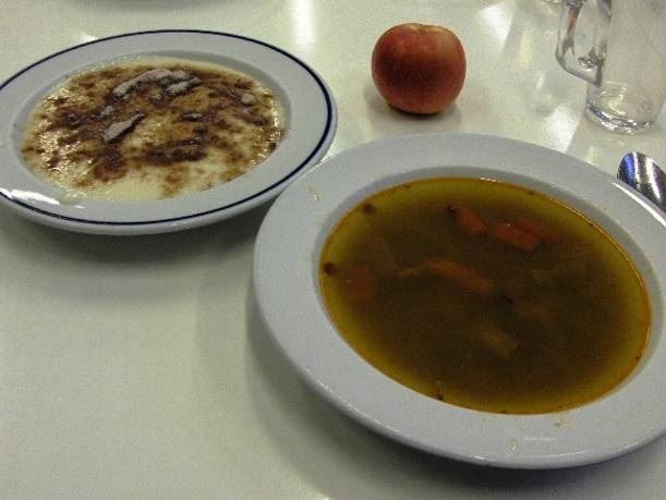 Barna színű, zavaros lében sárga- és fehérrépa, lencse, csipetke, 1 db vékony szelet kolbász, 1 pici darabka húsos szalonna. tetején narancssárga zsírcseppek. Híg leves, kevés a zöldség és a lencse.