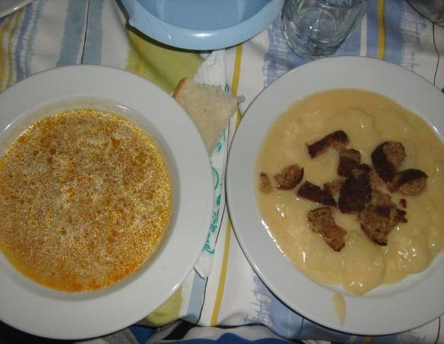 Viszonylag híg, zavaros, nem átlátszó lé. A tojás átfőtt. |
