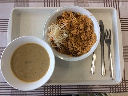 A rizs pergős, puhára főtt. A hús többségében rugalmasan puha, jól átfőtt, 1-2 kissé keményebb darab található. Rágási maradék nincs. |