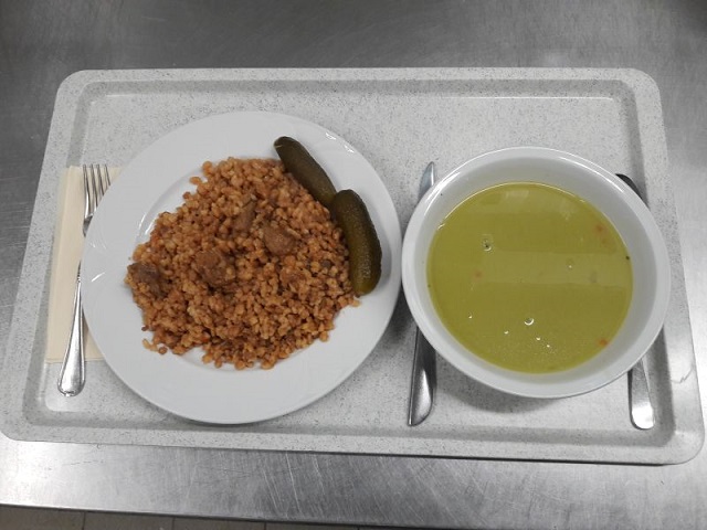 Menü: Zöldborsókrémleves, Tarhonyás hús, Csemege uborka