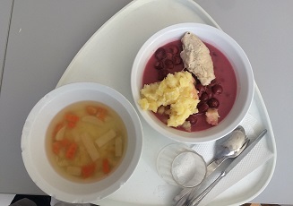 Világos meggyszínű, hígan folyó szószban eltérő színű (világosabb, sötétebb bordó), magozott meggy szemek. Élénksárga színű, különböző méretű kockára vágott főtt burgonya. Nem teljesen jól tisztított, néhány darabon héjmaradék látható. Kb. féltenyérnyi, fekete fűszerszemcsékkel ízesített, világos drapp színűre sütött csirkemell szelet. |