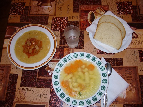 A lé opálos, a zöldségek jól átfőttek, a galuska kissé elpuhult. |