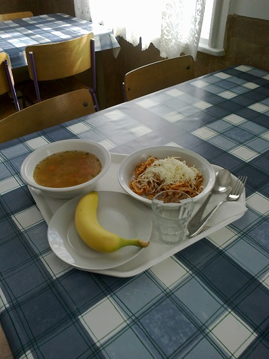 Menü: Karalábéleves, Bolognai spagetti, Reszelt trappista , Banán