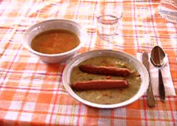 A lé zavaros, hígan folyó, a burgonyagaluska és a zöldségek puhák, túlfőttek. |