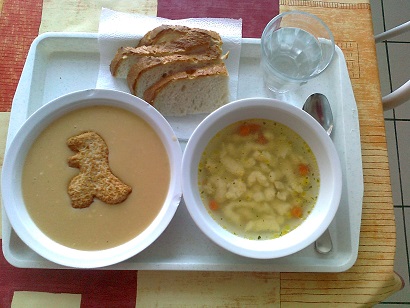 Menü: daragaluska leves, sárgaborsó főzelék, dínó feltét